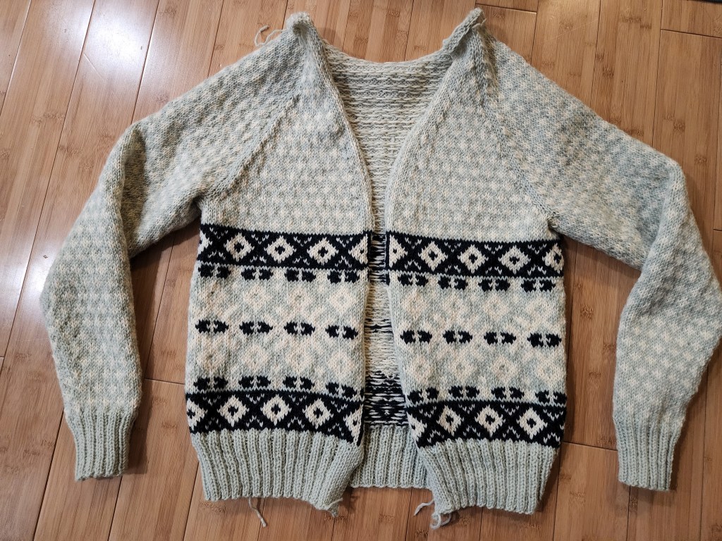 We have a completed body! It has been completely knit, underarms seamed, ends woven in, and it has been steeked. Last night I reinforced the steeks and cut it straight up the front. I don’t know why steeking is so satisfying, but it really is. I love the practicality of it. Tonight, I will wash and block the whole thing. I am hoping it will be fully dry by Friday. I watched fabulous tutorials from Suzanne Bryan on YouTube. I watched both the button band and the buttonhole tutorials. I think that if I actually sit down and do the math, my button band will look really nice. I am determined to rip it out and start over if I don’t think it looks good. I really liked her vertical buttonhole and will use that on this sweater. I still need to buy ribbon to sew over the raw edges. I am also still pondering if I want to cut in pockets. The jury is still out. I feel confident that it will be completed well before the dreaded camping trip deadline. I am almost done with this sweater!