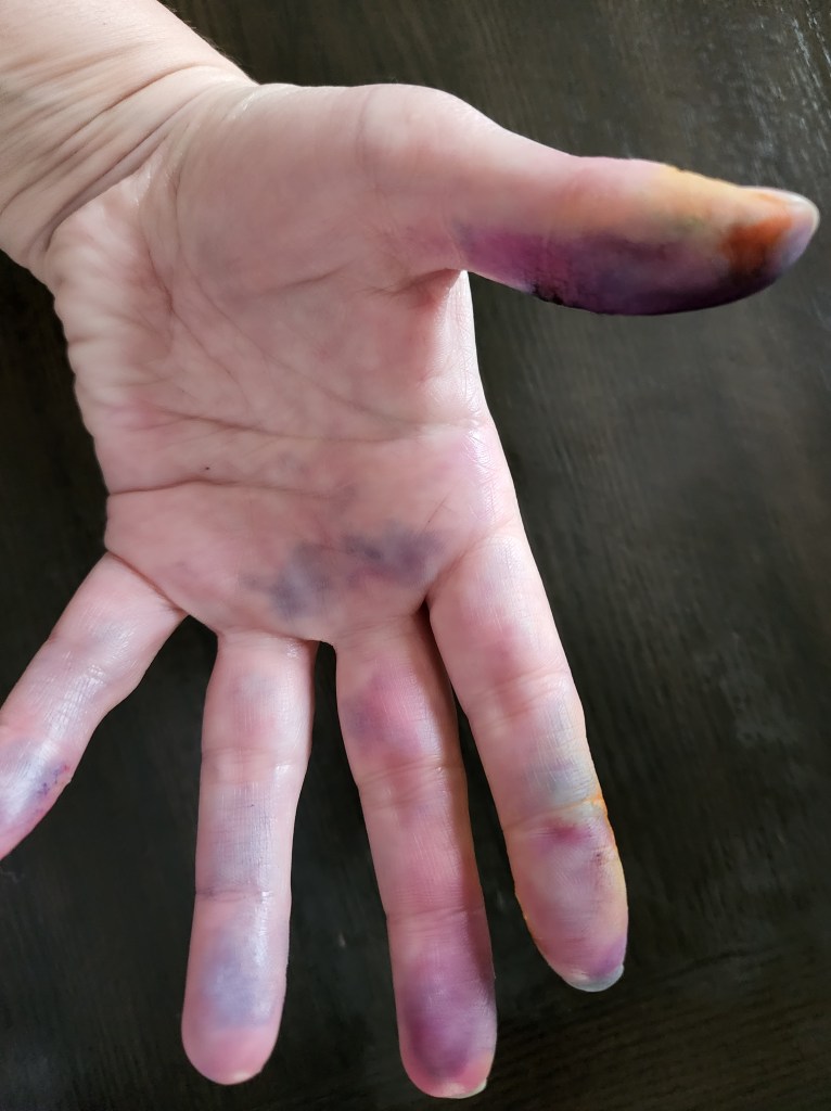 Spring break was here a couple of weeks ago. Since I have a J-O-B (which is necessary but quite inconvenient), I was not able to take the whole week off. Feebs and I did decide to take that Thursday and Friday off, though, and have a special girls only couple of days. We did all manner of fun crafting things like painting rocks for the garden, going to a paint your own ceramics place (that was a rather expensive endeavor!), and tie-dye t-shirts. I had never done tie-dye before. Feebs did a shirt earlier that week at her camp, and had a lot of fun doing it. We decided to head to Joann’s and pick up a kit. We bought 3 shirts, one for each of us, and one for The Mother, for Mother’s Day. We got home, and thank all that’s holy, I had a spare shower curtain. (Note to self: Ikea has plastic shower curtains for like $2 a piece. You cannot put a value on having your counters/ tables/ deck/ etc. protected. It is priceless and worth every penny. Stock up on them while you have young, creative kids!) We put it down and mixed the dyes. Since I had never done this before, I watched a YouTube video on the process. I really wish I had heeded his warning about wearing rubber gloves through the whole process. The picture was taking 3 days later, after several attempts to remove the color from my skin (dish soap, nail polish remover, and Mr. Clean magic eraser).
