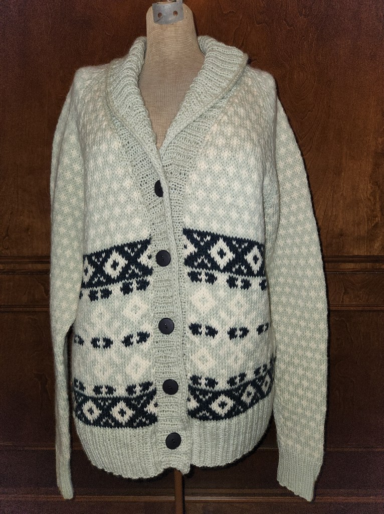 I would love to lie and say that the sweater is flawless and everything went 100% to plan, but this is me we are talking about. Of course there were mistakes. I messed up the body pattern and didn’t realize it until about 3 inches up. There was no way on God’s green earth that I was going to rip back and pray that I wouldn’t loose stitches. I only did it over about 20 stitches, so I dropped them down and fixed the color pattern. This would have been an amazing fix if I hadn’t royally screwed up and twisted some stitches, had a super long leftover float, and maybe had more of the correct color yarn to work with so that the stitches weren’t so tight. I thought that it may block out, but nope, it’s front and center, right across the middle of my shoulders. I notice it 100%. Ms. H says only I notice it, so I am going with that, and will try not to fixate on it. The sleeves are too long because I decided to modify the pattern. The pattern instructs you to knit 6″ cuffs, so that you can turn them back. I didn’t wanted doubled up cuffs, so I only knit 3″ and I forgot to deduct the excess 3″ from the over all sleeve length. I also had a bit of a challenge knowing how to follow the pattern at the neck decrease. I was always supposed to begin and end with the main color, but I would forget or it would leave too big of a gap between the Moss and the Cloud. I don’t think it is noticeable at all, so I am going to ignore it. My final blunder was that I ordered really nice buttons. I found them on Etsy and ordered them right away. I waited days for them, and was so delighted when they finally showed up. I snatched them up and ran them to the cardigan to see if the color worked. The color was great! I started placing them on the button band, and had them all laid out, ready to sew on. I wanted to give them a little test with the button hole. They didn’t fit… They would in no way go through the buttonhole. Not even with a bit of force. I had ordered the wrong size buttons. This was incredibly annoying. The very nice buttons were sent to my stash for a future project, and I was sent to Joann’s. The buttons aren’t the most vintage glam, like the others, but they compliment the contrast color and they do the job. Note to self: You are not in control of the world. A 1 1/4″ button will NEVER fit into a 3/4″ buttonhole, no matter how much you want it to.