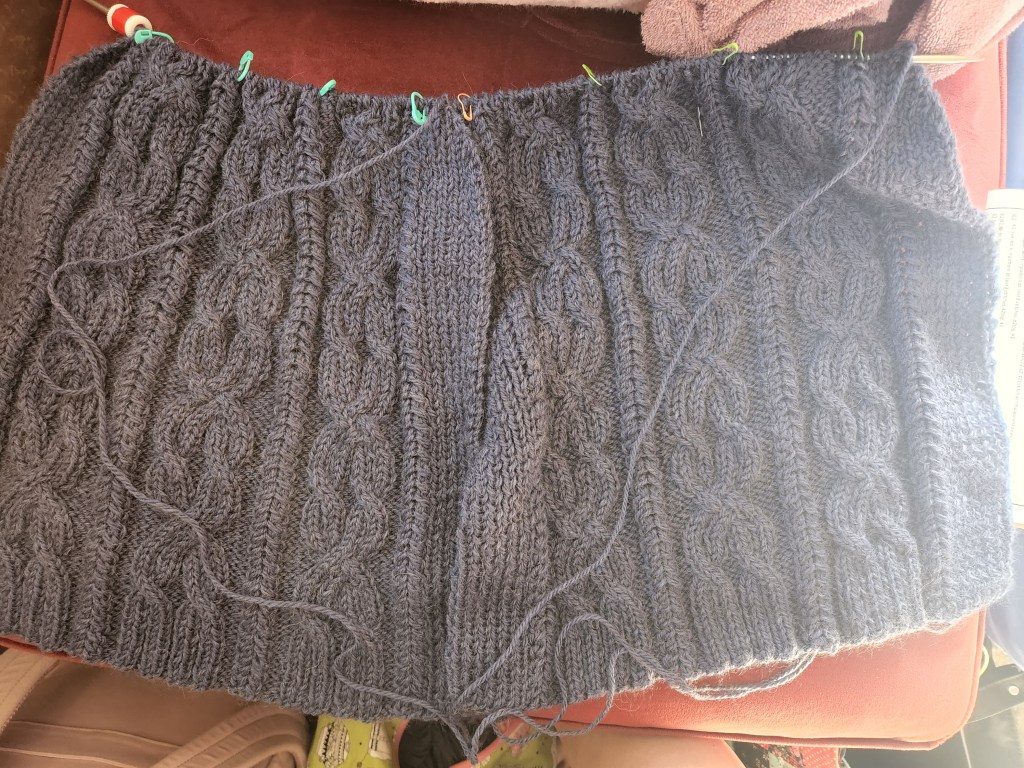 I knit the two body pieces at the same time on long cabled needle. I like doing this with pairs, i.e. sleeves, sock feet, etc. I like for my tension and mistakes to be uniform. I messed up on cable cross over, but I did it on both front and back so it is a feature instead of a mistake. I knit the two together until after the underarm shaping was completed and it was time to start working on neck decreases.