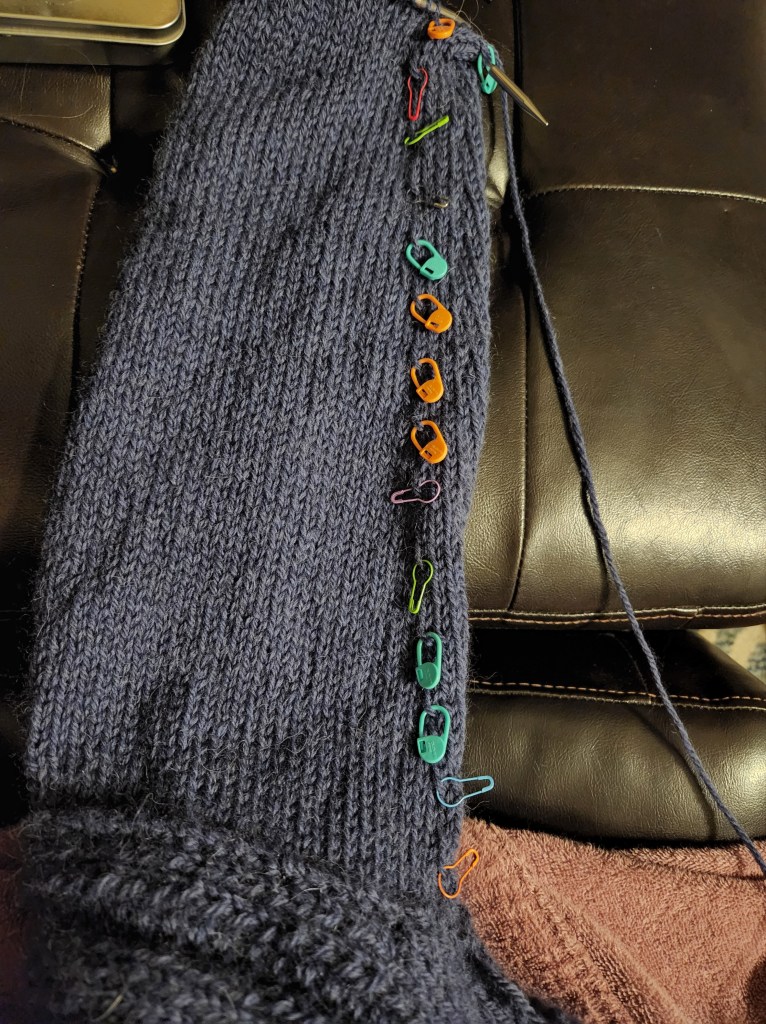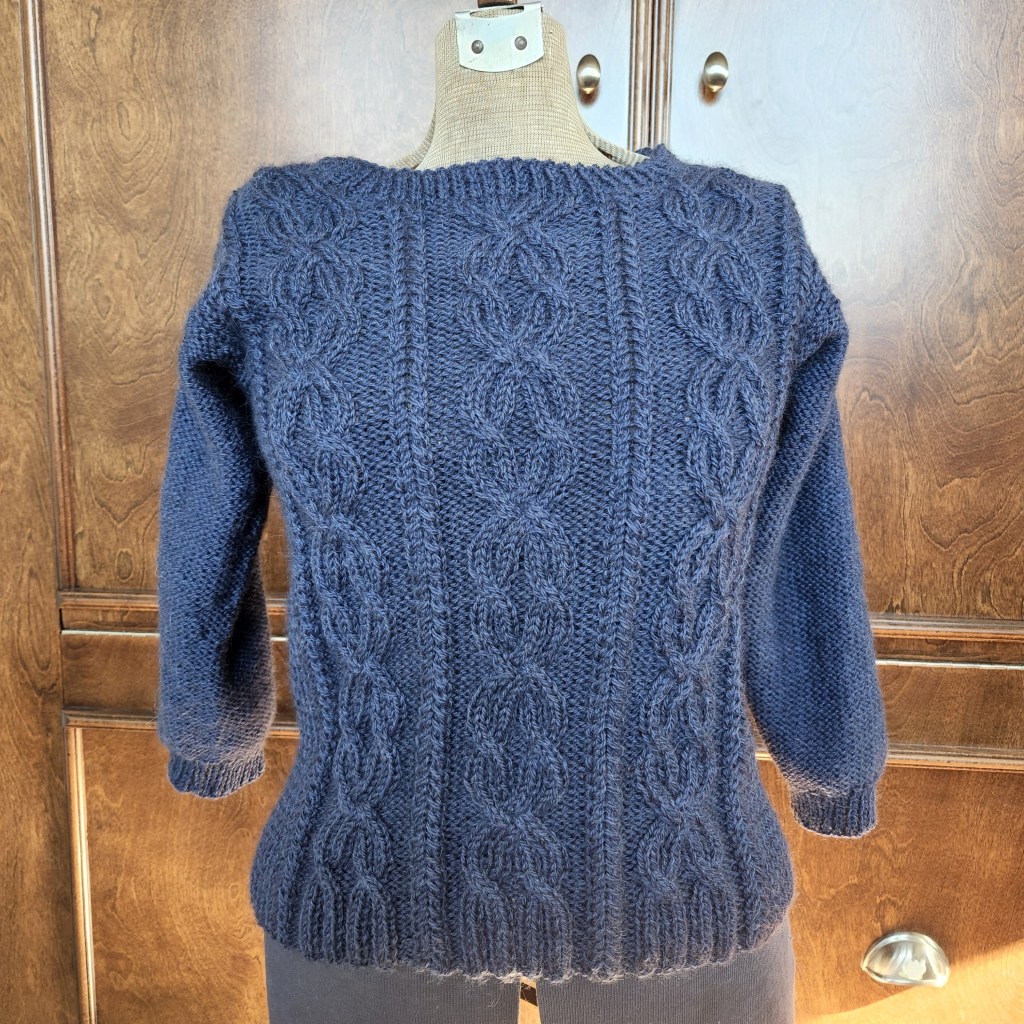 My lovely Jameson is finally done. I have nerve to have taken so long to complete this sweater. It really should have been done much faster. It is a lovely knit flat, seamed together sweater. It is knit from the bottom up- not my favorite, but a good “out of my comfort zone” project. I enjoyed the knitting and found the pattern fairly straight forward. It was easy to get into a flow with it and to read the knitting to know where you were, and what was coming. I knit it using Lion Brand LB Collection Merino, Yak, Alpaca yarn in Navy.