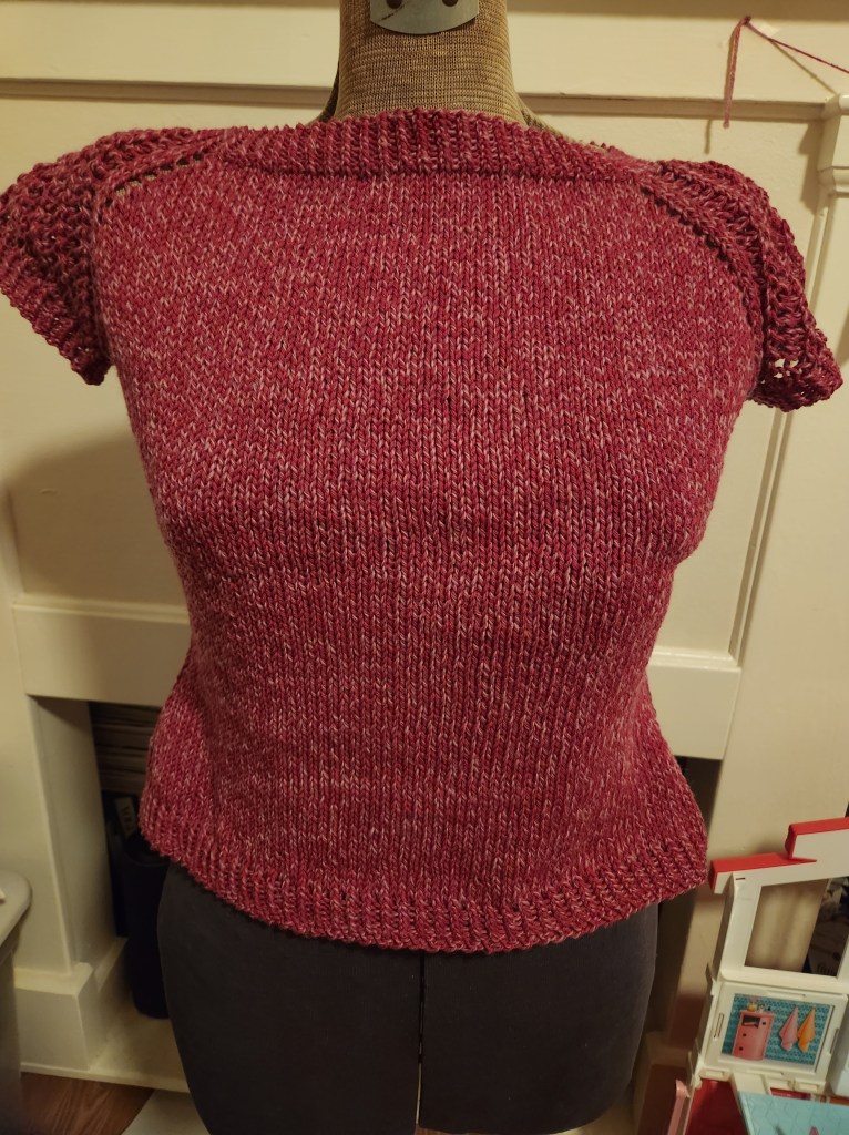 Deodara, by Maria Olson. This was knit in Brown Sheet Serendipity Tweed, in a variegated pink/ fuchsia. There will be a separate post for this top.