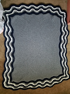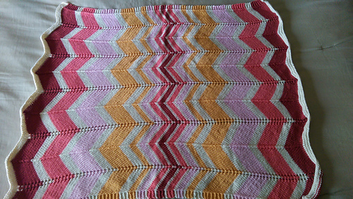- Chevron Cherub Wrap- Lisa Siefert (https://www.ravelry.com/patterns/library/chevron-cherub-wrap). This has been my go-to baby blanket since I started knitting baby blankets. It is very quick and can be fancied up if desired. The first time I knit it, I followed the pattern and did it in stockinette. I learned that was not my jam due to the rolling that all good stockinette foists upon you. I have since always knit it in garter stitch.