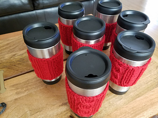 - Coffee Sweater- Allison Griffith (https://www.ravelry.com/patterns/library/coffee-sweater). These are amazing for last minute, inexpensive gifts. They are also fantastic stash busters. For Christmas, one year, I picked up travel mugs, the Husband’s hot cocoa packets, and an assortment of teas. Each sleeve took me about 1 1/2 hours to knit. In total, each gift cost me $5. I made 7 for my staff and 5 for the Husband’s co-workers.