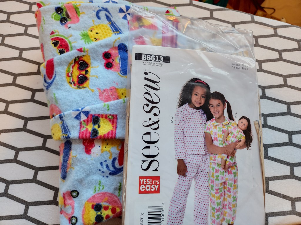 This month I have sewn garments for Feebs. I was wanting to use up some fabric in my cubbies, and had my eye on eliminating the food flannel. That fabric was turned into some pajama pants using See & Sew B6613. I have used this pattern for her jammie pants several times and have always used size 6. Since I am a complete heathen, I cut out my patterns, so it was never going to last past size 6. My girl is 7 now, and getting too tall for the 6- 6X size. She still has a little waist though and can fit in her 6- 6X size clothes. To fix the situation I added about 3.5 inches of cuffs using the same fabric in the opposite direction. This worked great and now they will last her at least through the fall (I hope).