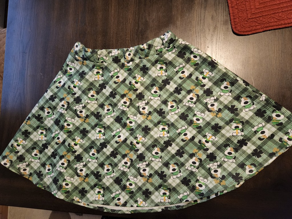Next came March 15, on which day she asked if I would make her a St. Patrick’s Day skirt to wear to school on March 17. So, off to Joann’s we went. We purchased 1 yard of the least ugly St. Patrick’s-esqe fabric they had and a circle skirt pattern. Yes, it could have just been a rectangle of fabric with some elastic thrown in, but I wanted to try something new. I made the Simplicity 8027 in size 6. I would have liked a bit more time to get everything right and even, but it came out pretty good for a rushed first time. I wanted to do a circle skirt so that I could try a sewn in waistband. I detest straight hems, so curved hems are absolutely the devil. The waistband is a bit puckered in a few places, but I feel it ended up pretty good.