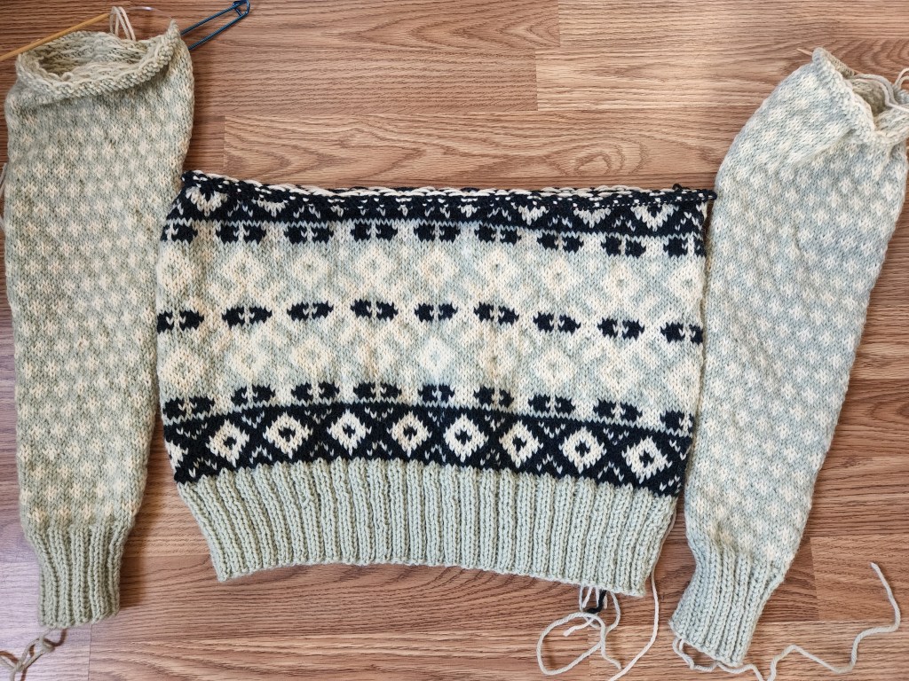 I have only knit one other all over colorwork sweater, Cobwebs by Megan-Anne Llama. I have also only steeked one project, the Dude Sweater by Andrea Rangel.
