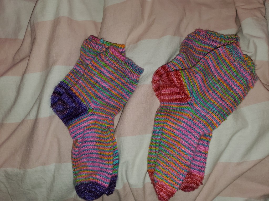 2 pairs of vanilla socks for Feebs- 52 stitch socks (7 years old). I used Duren Dyeworks for the body, and Marigold Jen Rainbow Connections for heals and toes.