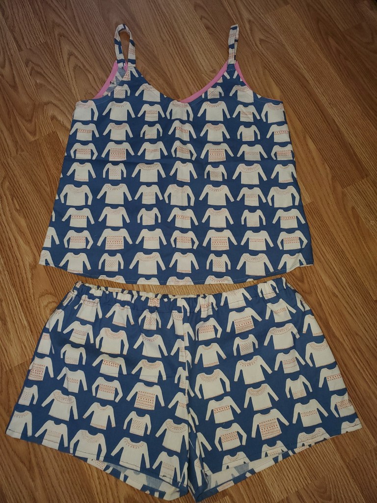 I sewed myself a set of summer jammies, consisting of shorts and a camisole. The fabric is from www.fabric.com, and is a super cute sweater print. It is a thicker 100% quilting cotton. I sewed as size 8 top, and size 40” hip bottoms.