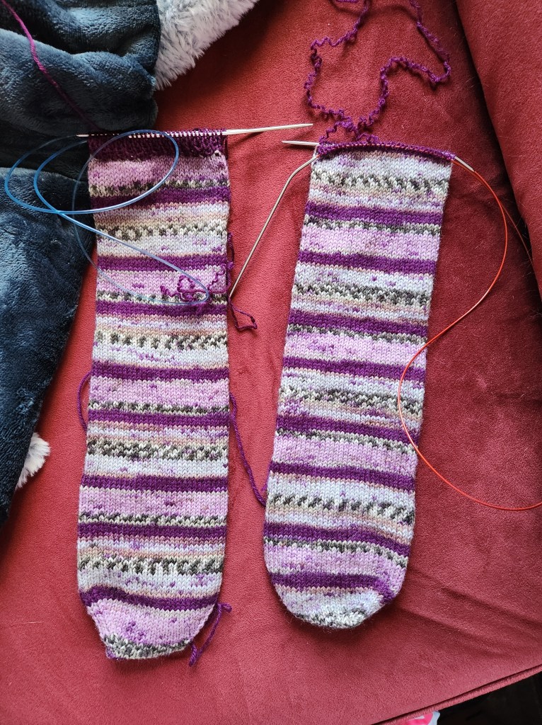And then there were two. The toe to toe pair was complete. I don’t think I will need to do a separate post for the contrast toe pair. It is the same basic principle. I am really glad that I did this. It gives me flexibility for the future and was a fun experiment. I will be happy to gift the finished socks to the Female O. I really hope they fit her and are comfortable for her to wear.