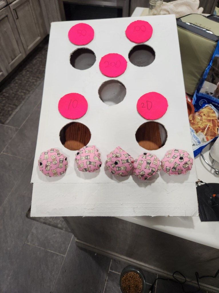The year keeps moving on. We just finished April and are in full blown Spring. The world is blooming, and the allergies are raging. I mentioned last month that I would have more finished objects this month, and man was I correct. I finished a lot of things. I have no new cast-ons and the WIPs have decreased. I didn’t get to the sewing, but that was because I was really busy with all of the things. I will get to my finished objects in a minute, but first I have to give a shoutout to Feebs and her first sewing project! She made an arcade game for school and she decided to make a version of cornhole. I had the leftover cat fabric from Oahu and she wanted to make the game-piece poofs out of it. The Husband helped her with the cardboard cutting and I helped with the poofs. Apparently, hers was one of the most popular game. It was very cute, and she was very proud.
