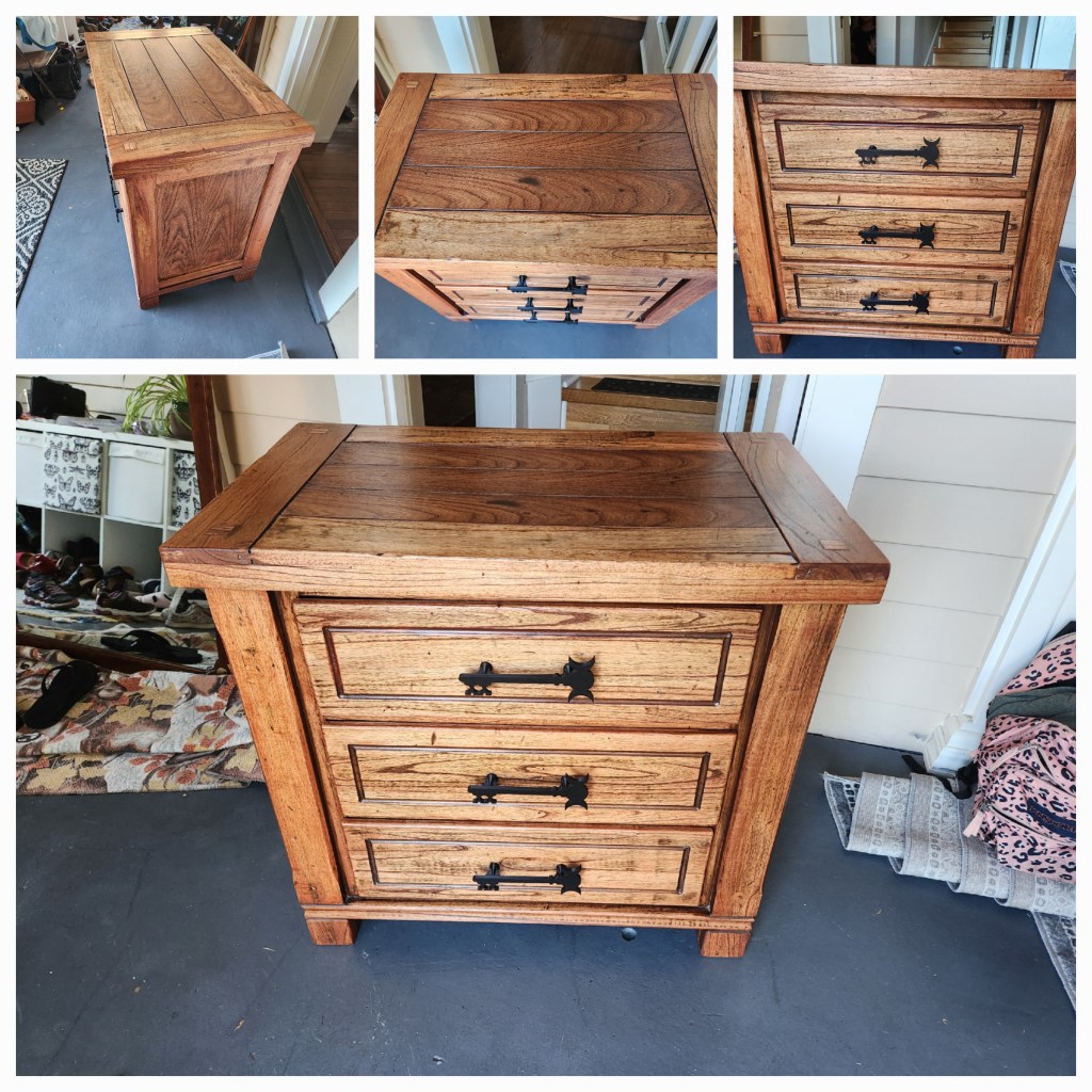 Hello darling. We have another refinished project, and oooh she’s fancy. This one didn’t take me as long to refinish once I got started, but it took me almost 9 months to start it. Last summer for about a week I would drive or walk up the main street by my house. There was a sad little dresser on the corner that had seen better days. I hymned and hawed about it. I was in the market for a place to put my sewing stuff and making notions, but wasn’t sure I wanted to take on a refinishing project. Then after looking at the poor girl for a week I was struck with motivation and had the Husband come pick it up for me, since I was on my walk. He sweetly drove up, loaded it up and put it in the garage. It sat in the garage for 9 months. I found another solution for the stuff that I needed to store and was pondering getting rid of it. Two weeks ago the Husband asked me to refinish it for his room. So I got to work. I already had everything that I needed after finishing the headboard. The Mother had some cherry stain that she wasn’t using and was happy to get it out of her garage. The original handles did not spark joy, so I decided to get some new ones. The Husband loves his keys, so I ordered some custom 3-D printed key handles on Etsy. Once again I tried using a wood stripper, once again it did nothing. I rough sanded the finish off and smoothed out some of the damaged wood. Then I fine sanded to even everything out. The staining process is always a crap shoot. I don’t feel that I am super great at staining, especially when the furniture is built with a variety of woods. I did okay with the stain this time. It came out even and didn’t get streaky. The varnish didn’t do great. There are definitely spots that have some white residue where I missed some air bubbles. It is only noticeable when I point it out, though. All in all, I am very happy with the end result. I feel like I was able to perform a pretty dramatic makeover on this little curb-gnomed dresser. It only took a couple of weeks and about $20 worth of products. This is also the first furniture rehab that I completed totally on my own in MANY years. Now she’s done, and she’s pretty, and the Husband will (hopefully) be happy with her.
