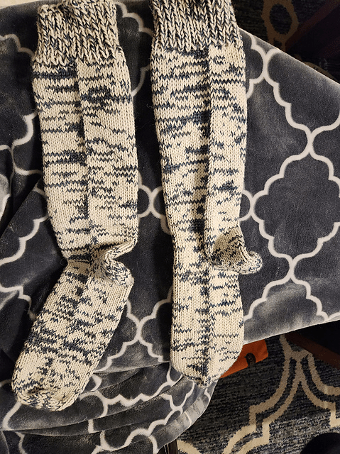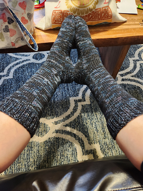 Another pair of worsted-weight vanilla socks. I pulled out a deep stash skein of Stranded Dyeworks BFL fingering weight yarn (left over from a Pavement sweater) and paired it with Paton Kroy in charcoal.