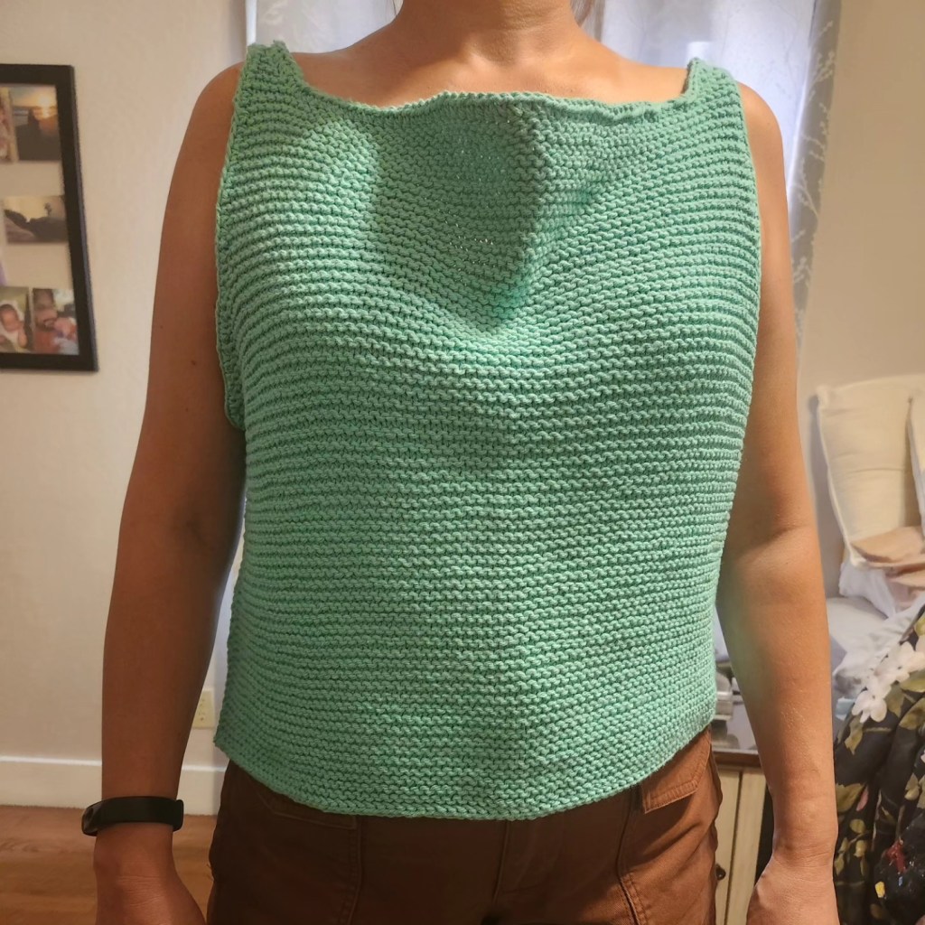 In summary: I am going to see if one of my sisters, with larger busts than me, wants it. I hope someone can wear it. I do think the top could be cute on the correct body. I don’t think I will knit it again. There is nothing wrong with it, and I do have some yarn that would be better suited. I just don’t think I will wear this top if I give it another try. I bought another true tank top pattern from Caidree, and I am hoping that that one goes better. It is a standard V-neck tank, so hopefully, it works better for me.