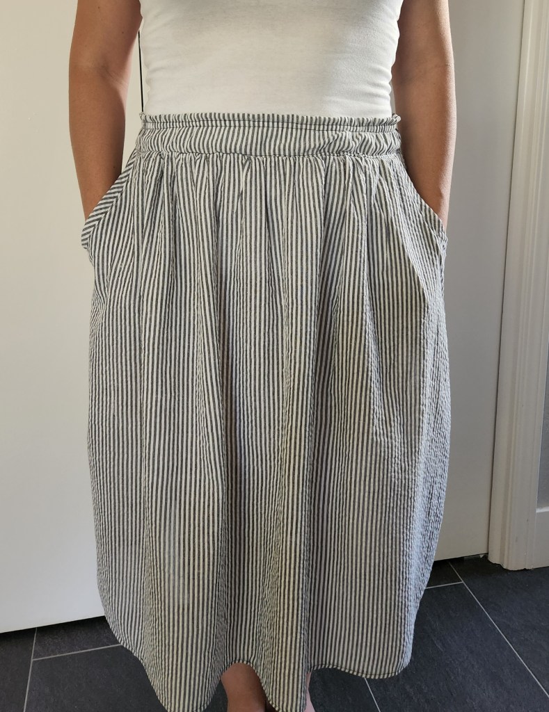 Lawley is finally done. I have to give myself some time to digest this pattern. My initial feeling is very conflicted, but I think I am just coming down from being frustrated. I made this using a cotton seersucker. Why did I use this, you ask. I used it because I was shopping for a good fabric for pajama pants, about three years ago. I didn’t have a clue what seersucker was, but went ahead and bought 3 yards of it anyway. Since I am trying to use of up some of my fabric stash, I figured this skirt would be the best fit. This is an incredibly sheer and fraying fabric. It is lovely, but I honestly have no idea what you would make with it that wouldn’t need to be fully lined. I sewed size Large. I think I could go down a size, but, keep reading and you will find out why I am so glad that didn’t.
